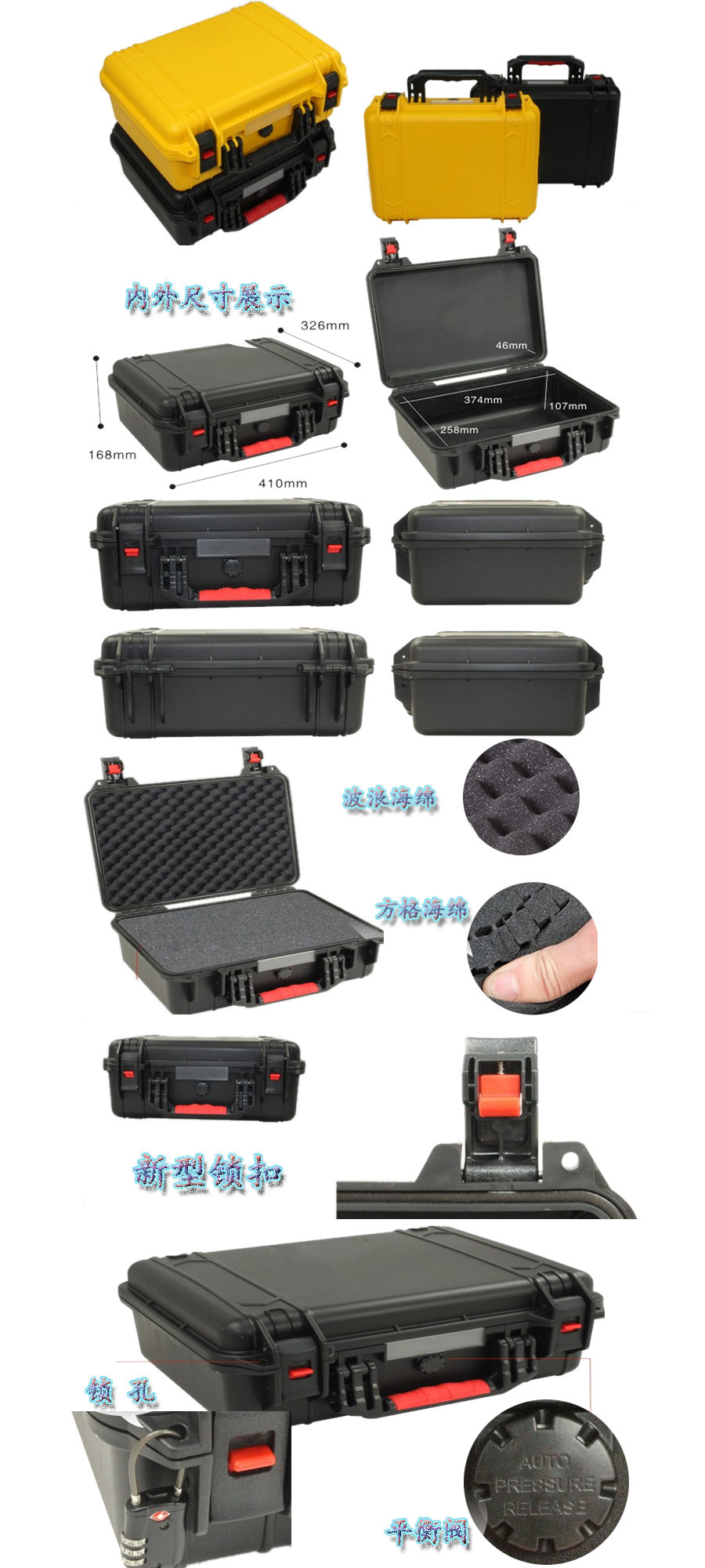 簡要說明:廣泛用于傳媒、公安、消防、軍隊、航空、戶外攝影、野外考察、科學探測等眾多領域的高端儀器、儀表。具有高強度、高抗壓沖擊、防潮、絕對密封、防塵、防水等特點。產品材質:ABS原料,箱體采用高抗沖擊的高分子聚合材料一體注塑成型,密封采用扁型彈性發泡密封橡膠條,確保防水氣密,所有較軸均采用不銹鋼材質。